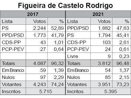 Para este mandato, Carlos Condesso compromete-se a «dinamizar primeiro a economia local, depois é cativar investimento e captar cada vez mais fluxos turísticos para deixarem riqueza neste território, porque Figueira de Castelo Rodrigo é abençoada por um património edificado e paisagístico invejável». Paulo Langrouva (PS), que presidia à autarquia desde 2013, obteve 45,41 por cento dos votos e elegeu dois vereadores. Dora Vilhena (CDS-PP) conseguiu 2,61 e Delfina Bazaréu (CDU) teve 0,61, enquanto Margarida Bordalo Bento (Livre) contabilizou apenas 0,23 por cento dos votos. A abstenção foi de 26,77 por cento.