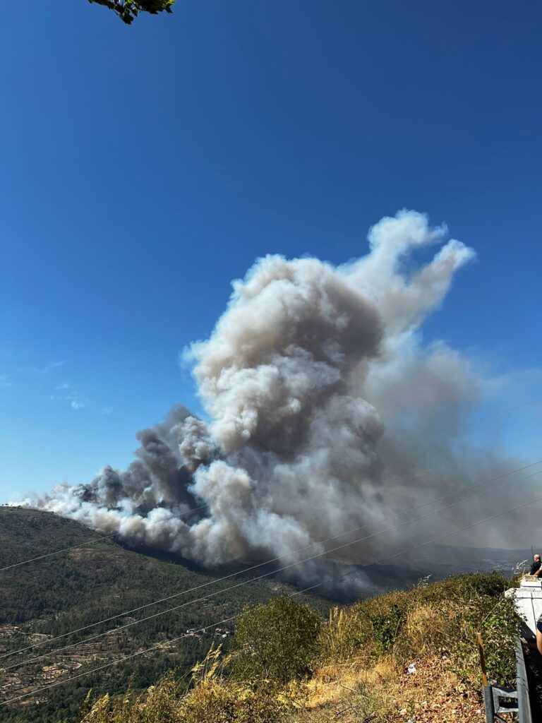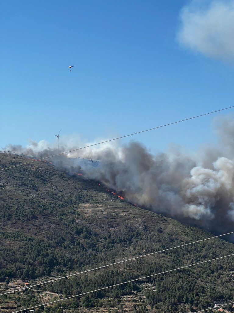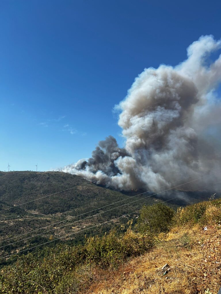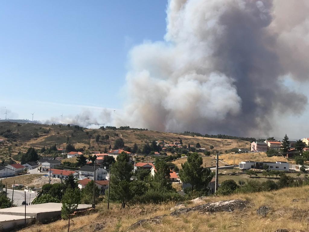 O incêndio em Mizarela, na Guarda, deflagrou às 15h36 desta tarde. No terreno estão 63 operacionais, 9 viaturas e 7 meios aéreos.