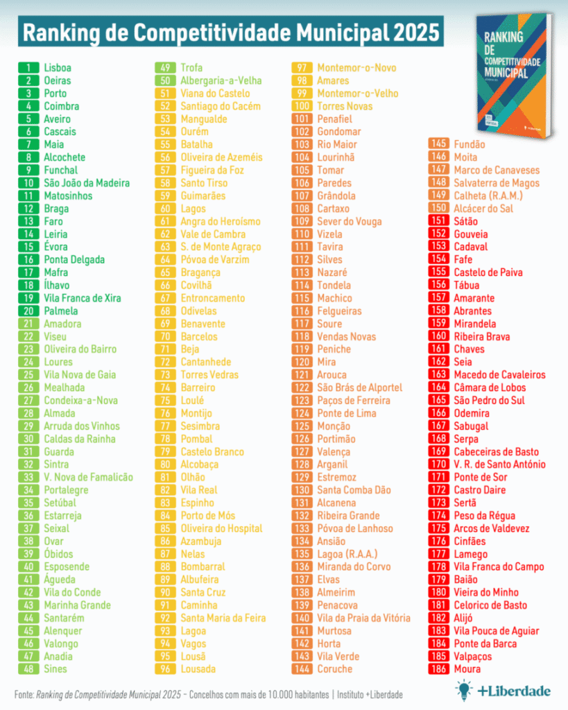 O ranking de Competitividade Municipal foi feito pelo Instituto Mais Liberdade e os resultados resultam de 11 categorias de competitividade (10 categorias nucleares + Competitividade Envolvente), compostos por vários indicadores que resultam de dados públicos e comparáveis (INE, Pordata e outras fontes públicas), e normalizados numa escala 0–100. Estas categorias estão agrupadas em três diferentes dimensões: Famílias e Empresas pesam 50 por cento, Serviços, Infraestruturas e Governação Local vale 40 por cento e a Competitividade Envolvente representa 10 por cento da pontuação final.